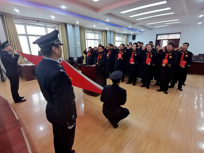 “我宣誓:忠于中华人民共和国宪法,维护宪法权威,履行法定职责,忠于祖国、忠于人民……”上午9:00,县法院党组副书记、副院长韩维左手抚按宪法,右手举拳,庄严领誓,县法院全体干警面对国旗庄严宣誓。